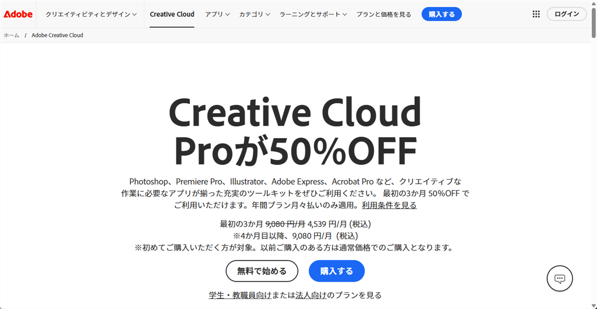Creative Cloud Proを12か月契約の年間プラン月々払いで契約すると、最初の3ヵ月50%OFF(月々払い 9,080円/月⇒4,539円/月)で利用できます。4か月目以降は 9,080円/月となります。