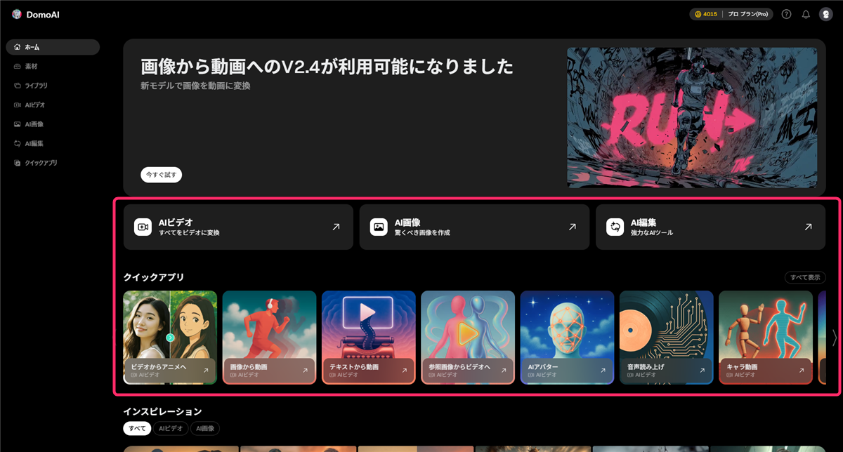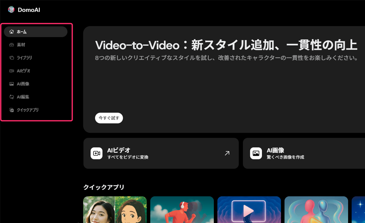 メインコンテンツエリアには、3つのメニューボタン「AIビデオ、AI画像、AI編集」が並んでいて、その下にクイックアプリの各ボタンが並んでいます。