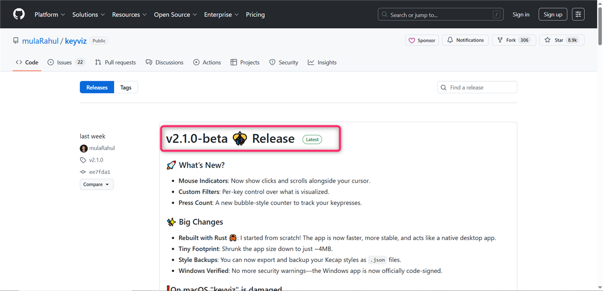 まずは、Keyvizの公式配布ページ(GitHub)へアクセスします。