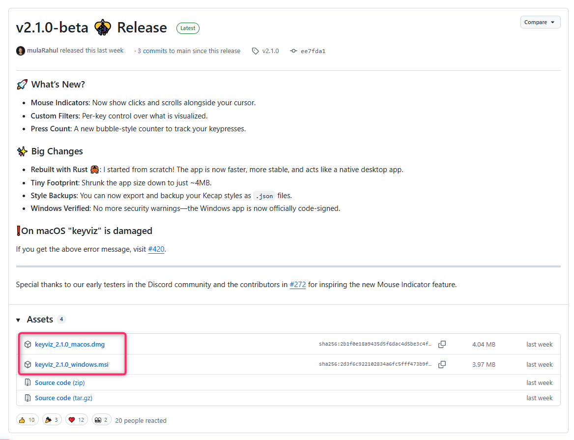 v2.1.0-beta Releaseページが表示されるので、下にスクロールして「Assets」という項目の中にある、自分のOSに合ったファイルをクリックしてダウンロードしてください。