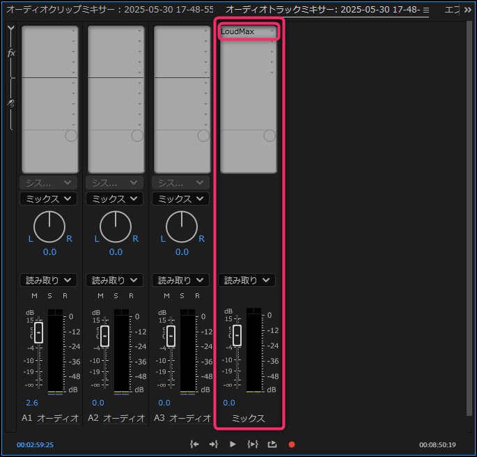 LoudMaxは、音声がすべてミックスされた後の最終段に入れるのがベストです。