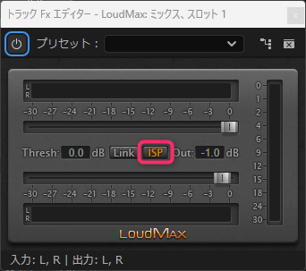 まず最初に、ISPボタンをクリックしてONにします。これによりTRUE PEAK(トゥルーピーク)対応になります。CPUの負荷が高くなりますがこれをONにしないとインターサンプルピークを高精度に図れません。