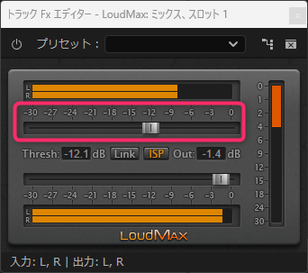 Outputで最終音量の上限を設定したら、オーディオを再生しながら、上のスライダー(Threshold)を徐々に左に動かしていきます。上のThresh:のところに設定値が表示されます。