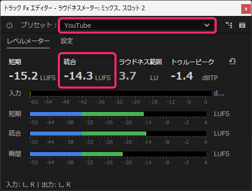 YouTubeは、動画のラウドネス(音の平均的な大きさ)が-14 LUFSを超えている場合、自動的に音量を下げる(正規化)仕様になっています。